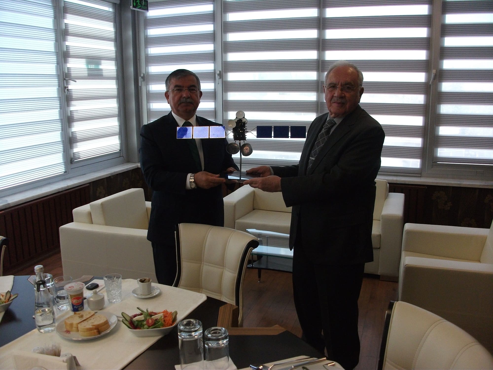 Türksat Yönetim Kurulu Başkanı Dr. M. Vecdi Gönül, ziyaretten duyduğu memnuniyeti ifade ederek, Yılmaz’a uydu maketi takdim etti.