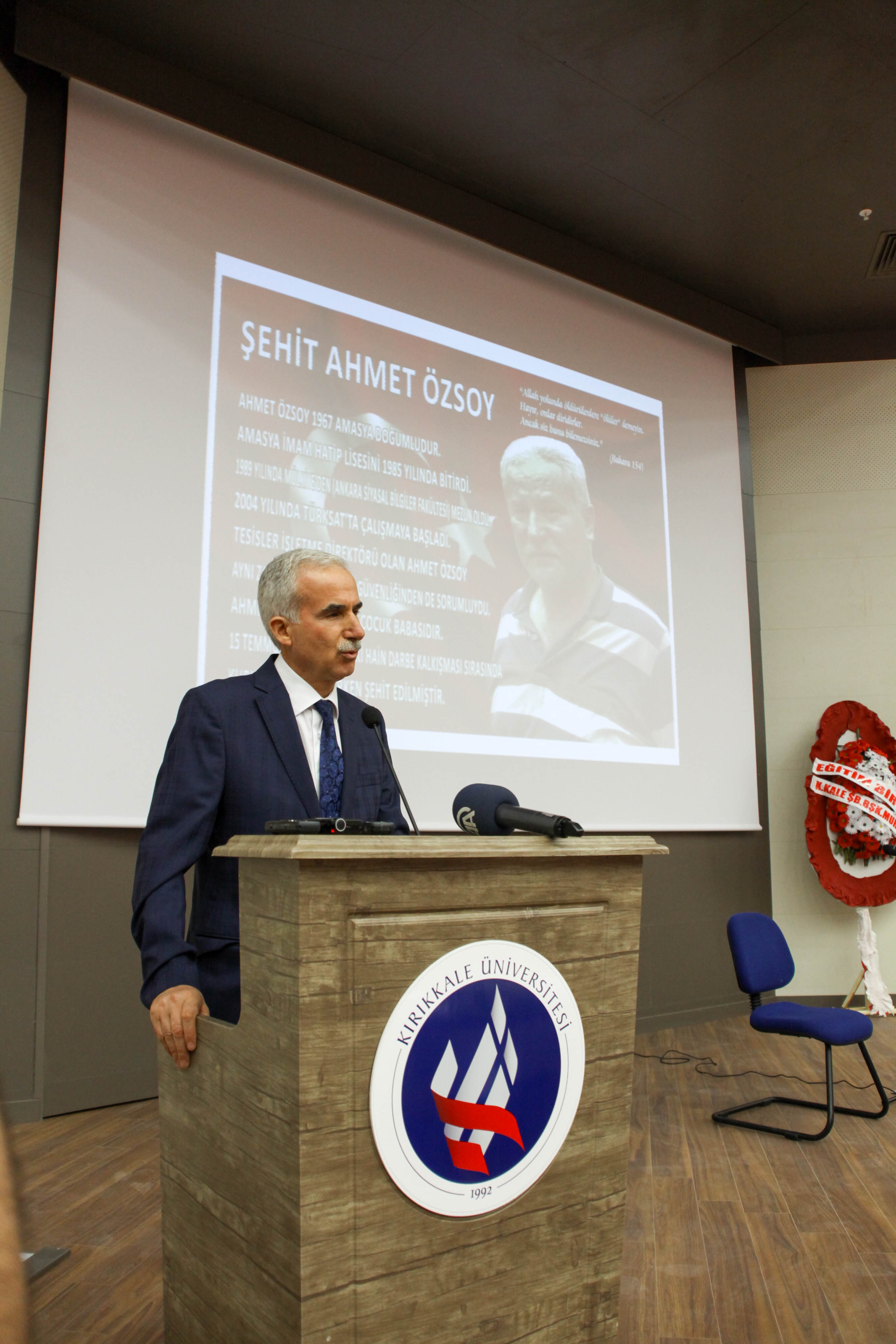 “İçimiz yansa da bu topraklar 240 şehidin taze kanıyla yeniden sulanmıştır. Bu menfur girişimde de Kırıkkale’nin şehitleri olmuştur. KÜ’nün de iki şehidi olmuştur. Birincisi Mühendislik Fakültesi mezunumuz Aydın Çopur, diğeri ise açılışını yaptığımız ve adını verdiğimiz Özsoy kardeşimizdir. Özsoy kardeşimiz, KÜ’nün ilk dönem asistanlarındandı. Allah rahmet eylesin. Mekânı cennet olsun.”
