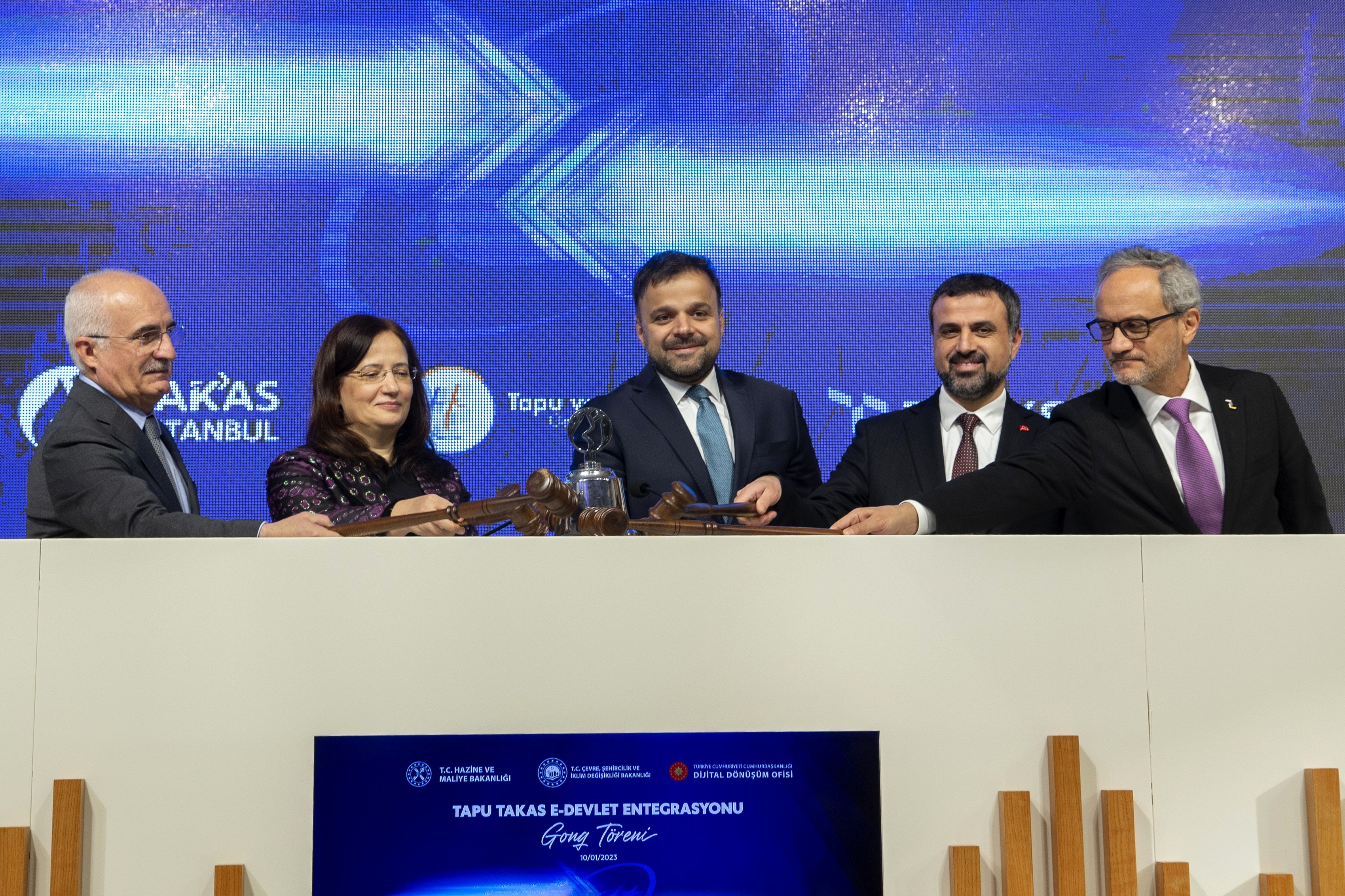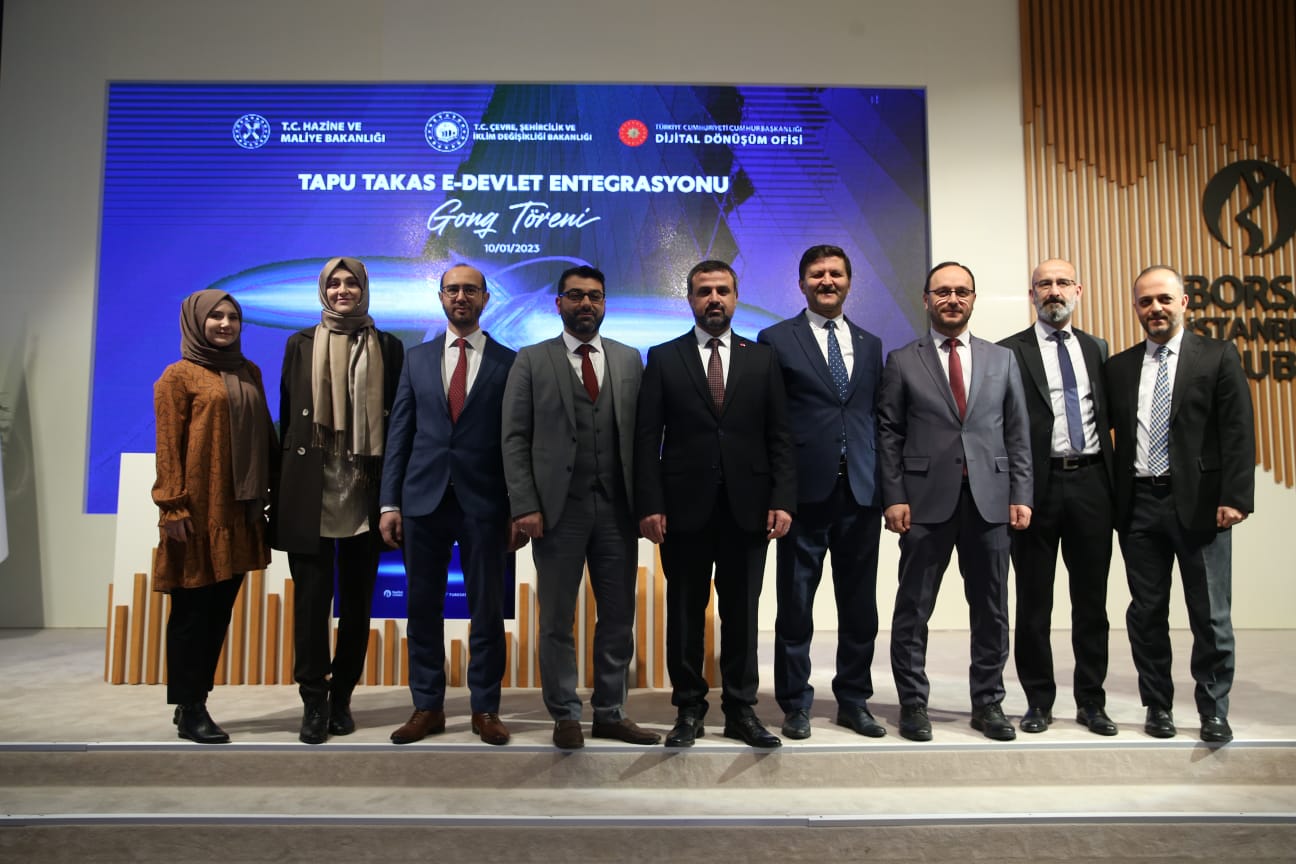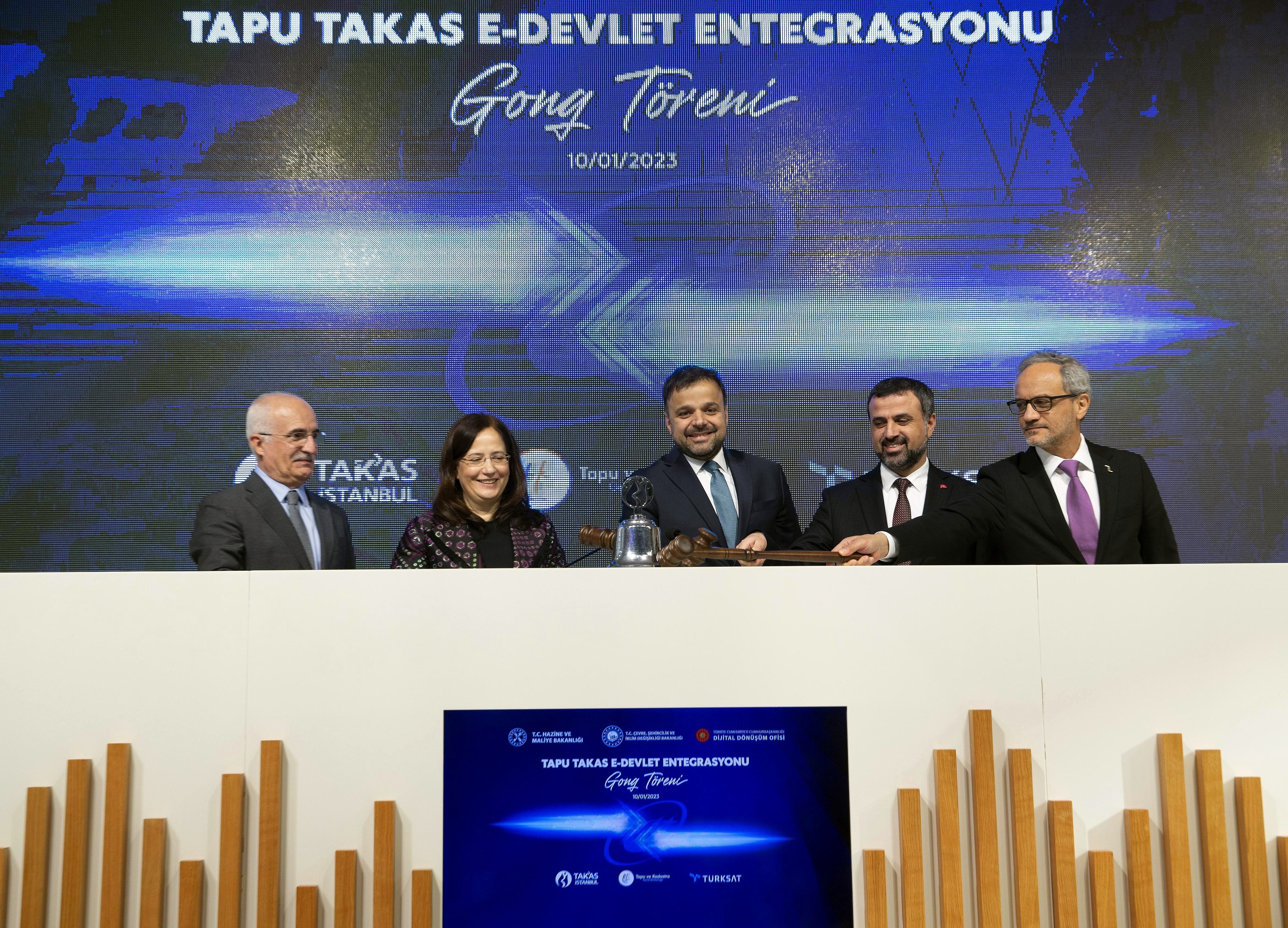 Tapu Takas e-Devlet Entegrasyonu Gonk Töreni, Cumhurbaşkanlığı Dijital Dönüşüm Ofisi Başkanı ve Türksat Yönetim Kurulu Başkan Vekili Dr. Ali Taha Koç, Çevre, Şehircilik ve İklim Değişikliği Bakan Yardımcısı Fatma Varank, Türksat Genel Müdürü Hasan Hüseyin Ertok, Takasbank Genel Müdürü Avşar R. Sungurlu ile Tapu ve Kadastro Genel Müdürü Mehmet Zeki Adlı tarafından Borsa İstanbul’da gerçekleştirildi.