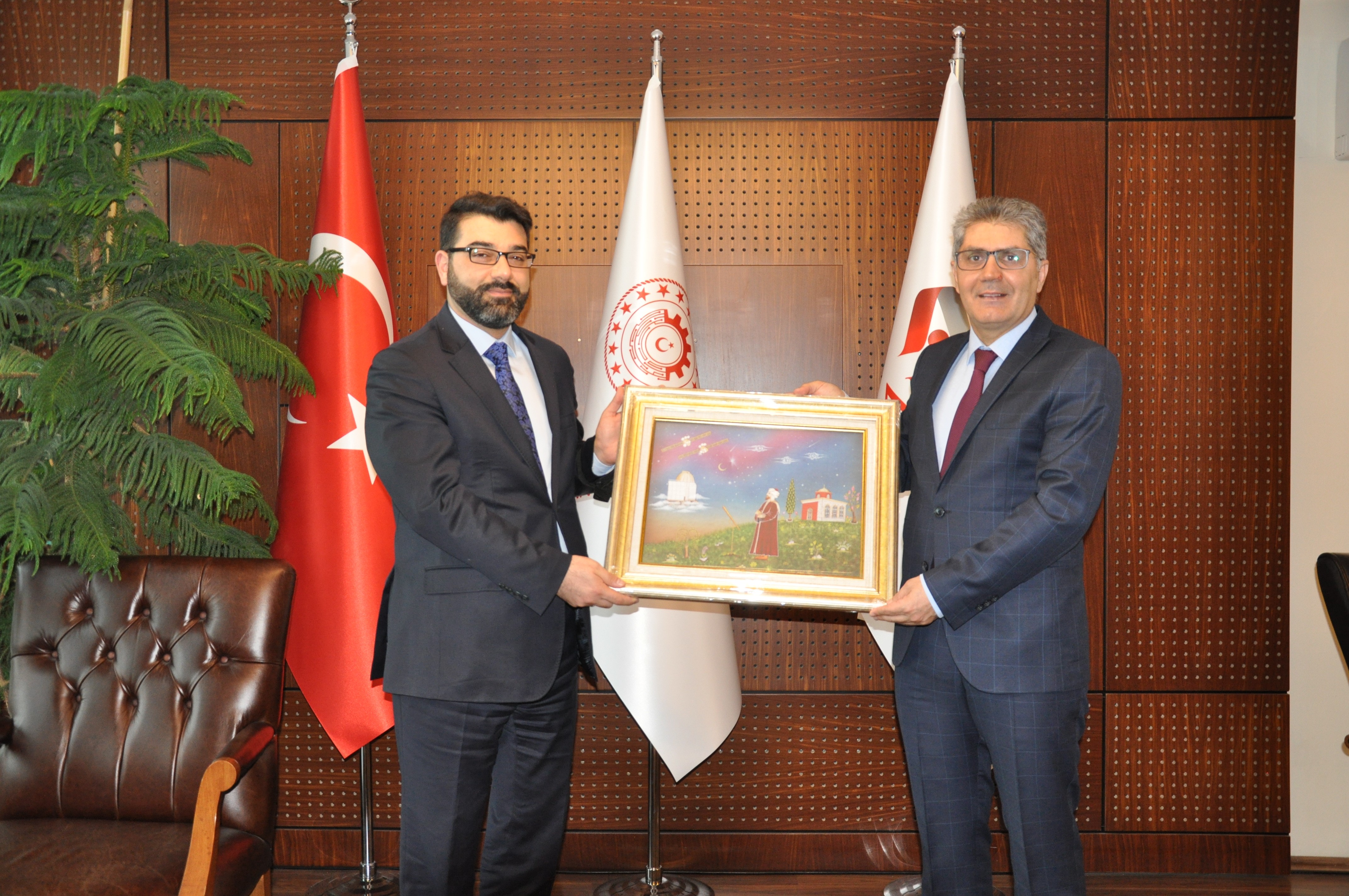 Genel Müdür Yardımcısı Çavuşoğlu, Genel Sekreter Dr. Cahit Çelik’e “Ali Kuşçu’nun Rüyası” temalı tabloyu hediye etti.