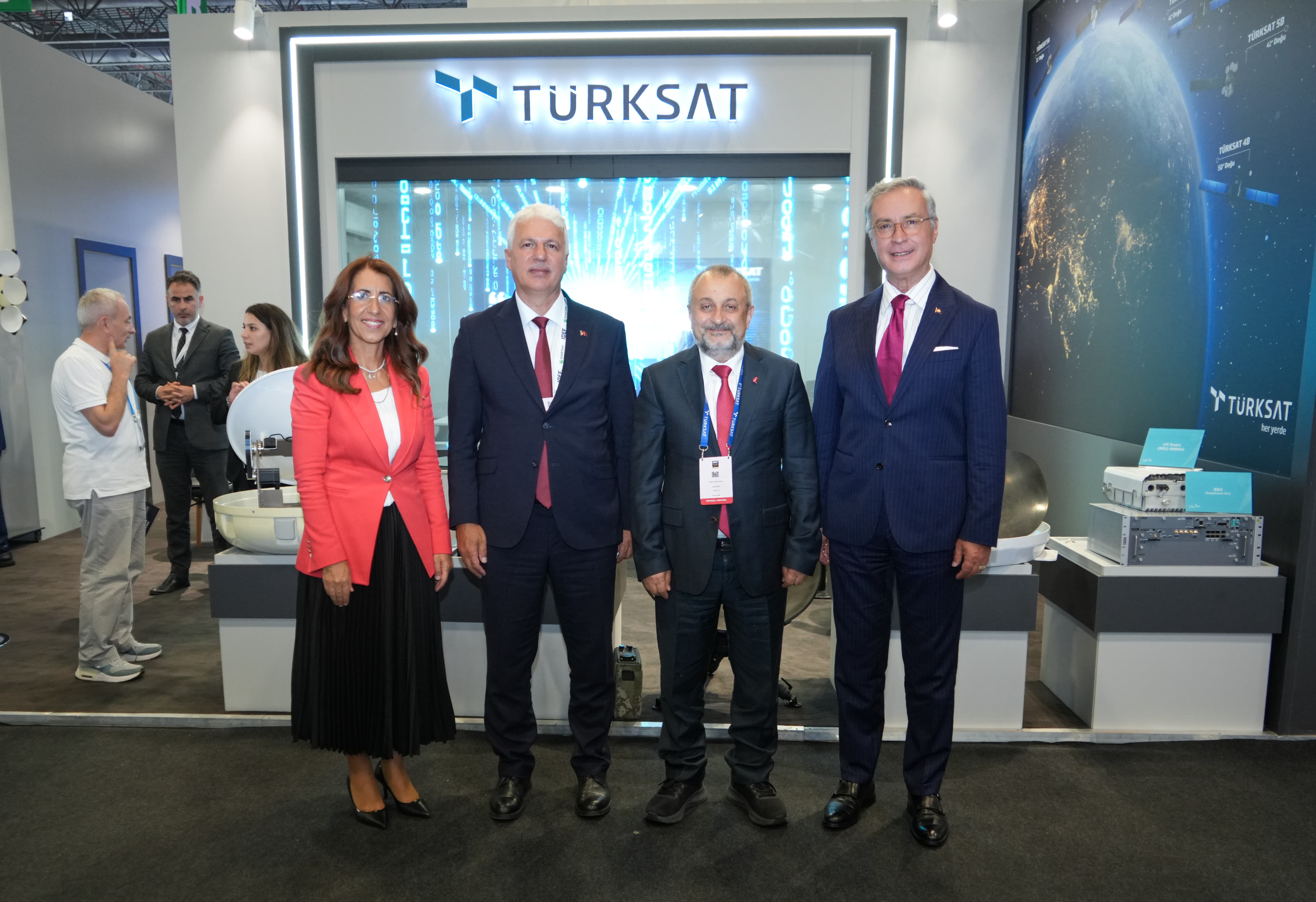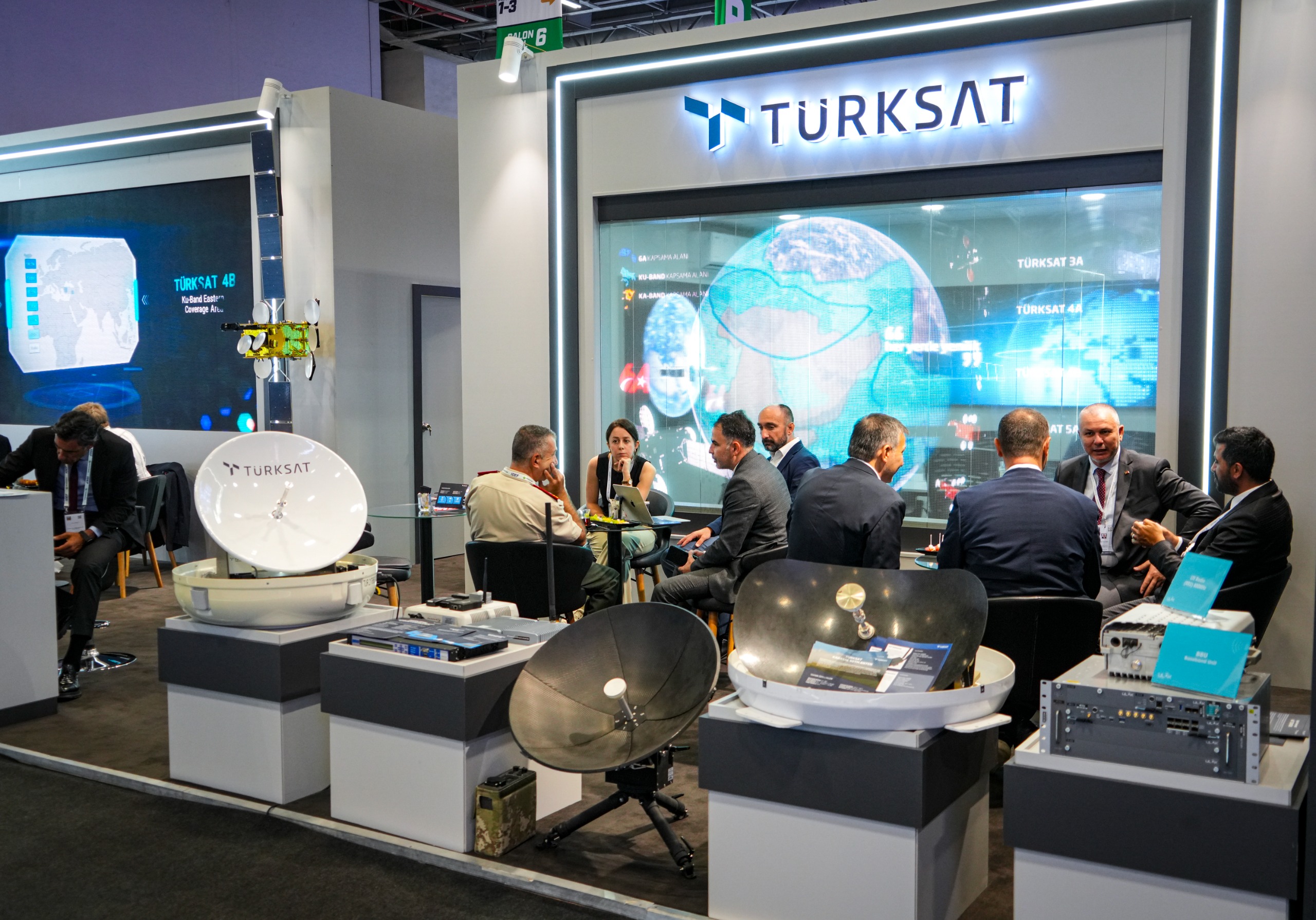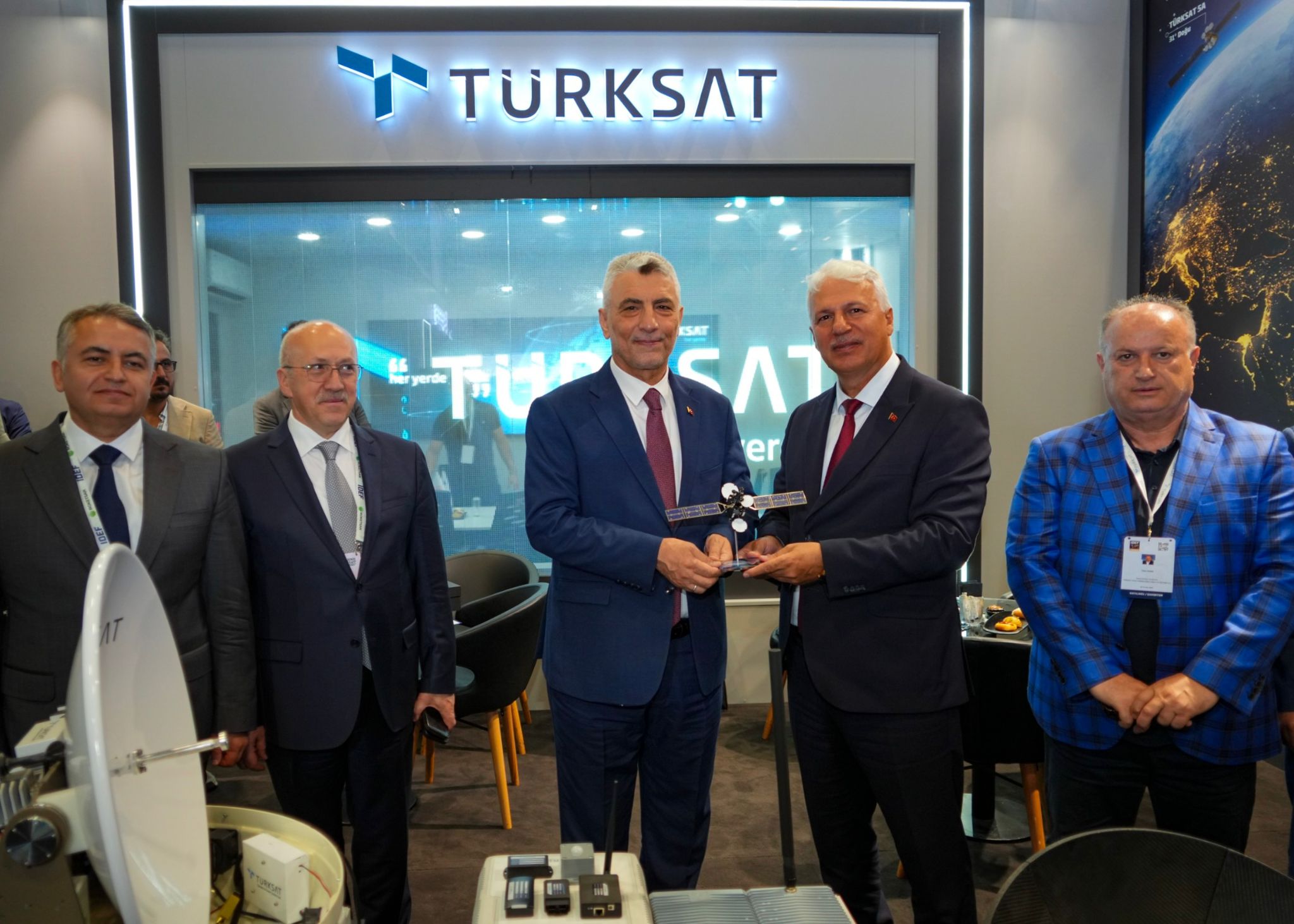 Cumhurbaşkanlığı himayesinde ve Millî Savunma Bakanlığı ev sahipliğinde düzenlenen IDEF 2025’e Yönetim Kurulu Başkanı Prof. Dr. Kemal Yüksek ve Genel Müdür Ahmet Hamdi Atalay başta olmak üzere, üst düzey yöneticilerle katılan Türksat; fuarda geniş ürün yelpazesini tanıttı. Türksat 6A’nın da filoya katılmasıyla birlikte 6 aktif haberleşme uydusuna ulaşan Türksat, bu gücünü uluslararası ziyaretçilere kapsamlı bir şekilde sundu. Fuarda ayrıca Türksat tarafından geliştirilen yerli ve millî hareketli uydu anten sistemleri ailesi PeycON da sergilendi.