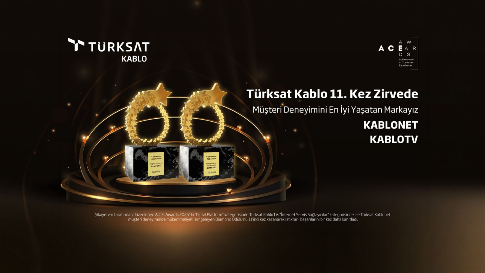 Müşteri memnuniyetinde en yüksek başarıyı gösteren markaların onurlandırıldığı A.C.E Awards 2025’te Türksat Kablo, sektöründe sergilediği üstün performansla iki ayrı kategoride birincilik ödülüne layık görüldü. Şikayetvar tarafından düzenlenen organizasyonda "Dijital Platform" kategorisinde KabloTV, "İnternet Servis Sağlayıcıları" kategorisinde ise Kablonet markalarıyla zirvede yer alan Türksat; müşteri deneyiminde mükemmeliyeti simgeleyen Diamond Ödülü’nü 11’inci kez kazandı.