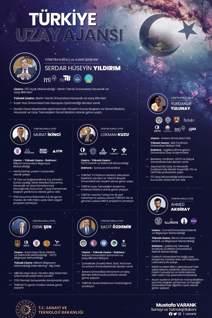 Varank, in his statement, said, "The Board of Directors of the Turkish Space Agency, appointed with the permission of our President, was announced with the decision published in the Official Gazette. We will carry Türkiye to the space league with our star staff that will realize our vision of 'National technology, strong industry' in the field of space and aviation." he said.