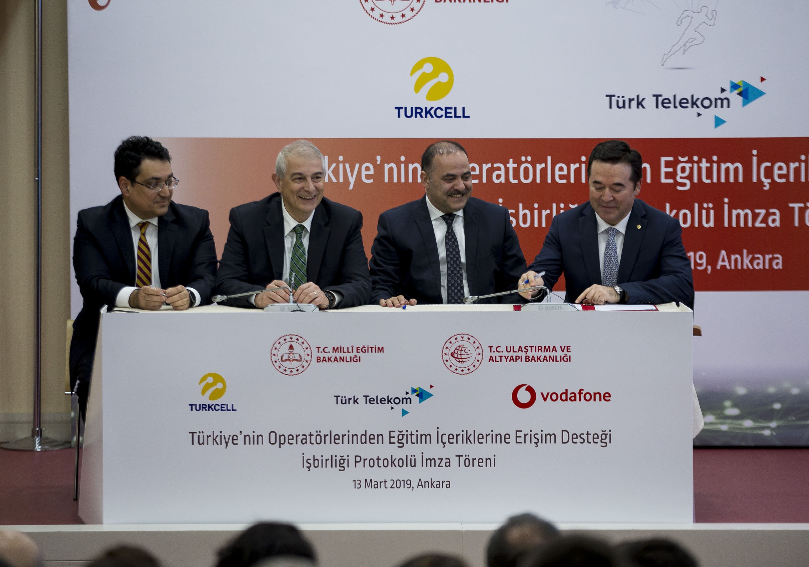 MEB Başöğretmen Salonunda düzenlenen törende, MEB, Ulaştırma ve Altyapı Bakanlığı ve GSM operatörleri arasında, “Türkiye’nin Operatörlerinden Türkiye’nin Eğitim İçeriklerine Erişim Desteği İş Birliği Protokolü” imza törenine Milli Eğitim Bakan Yardımcısı Reha Denemeç, Ulaştırma ve Altyapı Bakan Yardımcısı Ömer Fatih Sayan, Türksat Genel Müdürü Cenk Şen, MEB Yenilik ve Eğitim Teknolojileri Genel Müdürü Anıl Yılmaz, Turkcell Dijital İş Servisleri Genel Müdürü Hakan Erkan, Türksat Genel Müdür Yardımcısı Metin Çavuşoğlu, Türk Telekom Genel Müdür Yardımcısı Ümit Önal ile Vodafone Kamu İlişkileri Kıdemli Müdürü Burcu Önem katıldı.