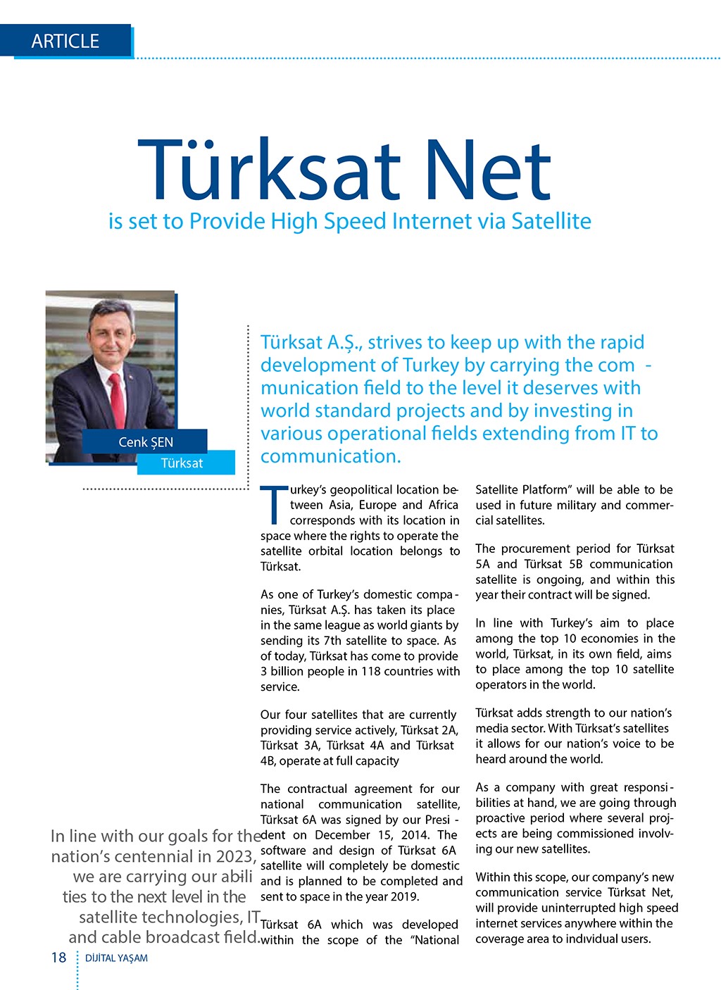 Uydu Elektronik İletişim İş İnsanları Derneği (TUYAD) tarafından yayınlanan Dijital Yaşam dergisinin IBC fuarına yönelik özel olarak İngilizce hazırlanan 15. sayısında Genel Müdürümüzün Türksat Net hakkındaki makalesi kapak konusu olarak yer aldı.