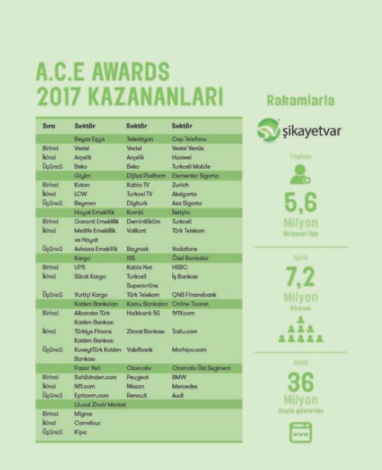 sikayetvar.com sitesi tarafından 400 binden fazla anket verisi değerlendirilerek elde edilen “Müşteri Deneyim Endeksi" ile Türkiye'de en iyi müşteri deneyimi yaşatan firmaları belirlemeyi amaçlayan A.C.E. Awards ödülleri sahiplerini buldu. Türksat Kablo geçtiğimiz yıl olduğu gibi bu yıl da “dijital platform" kategorisinde “en iyi online şikâyet yönetimi"ni gerçekleştiren firma seçilerek birincilik ödülüne layık görüldü.