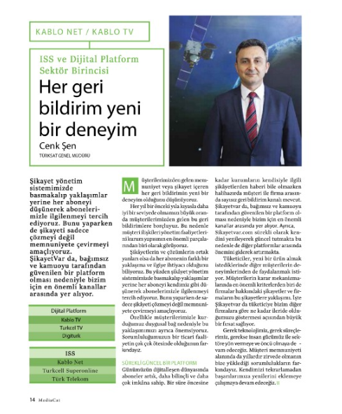 Türksat Kablo'nun A.C.E. Awards ödülü kazanmasıyla ilgili Mediacat dergisine demeç veren Genel Müdürümüz Cenk Şen, “müşteri şikâyetlerini, sadece çözülecek problemler olarak değil müşterilerimizin memnuniyetini sağlamada birer araç olarak görüyoruz" dedi.