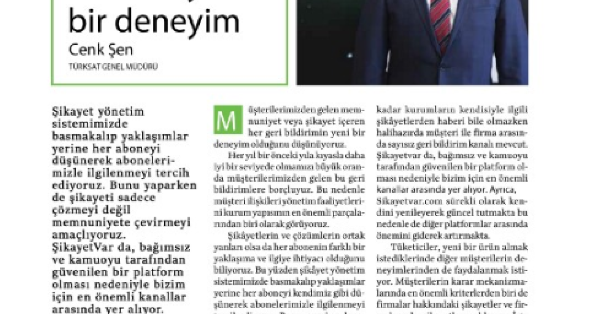 Türksat Kablo'nun A.C.E. Awards ödülü kazanmasıyla ilgili Mediacat dergisine demeç veren Genel Müdürümüz Cenk Şen, “müşteri şikâyetlerini, sadece çözülecek problemler olarak değil müşterilerimizin memnuniyetini sağlamada birer araç olarak görüyoruz" dedi.